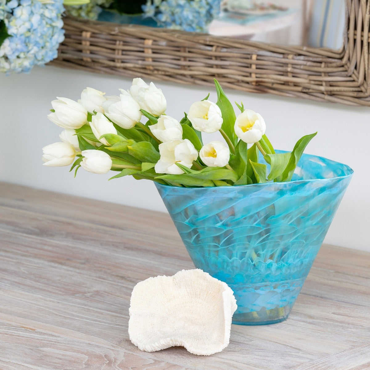 Create an oceanesque setting with this unique handblown glass bowl. The colors of blue and turquoise are spun to create a ribbon like effect. Each piece is unique being handmade by Italian artisans.