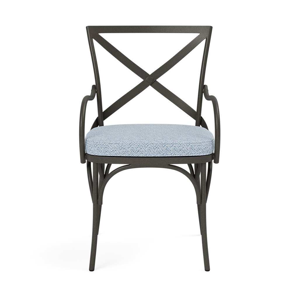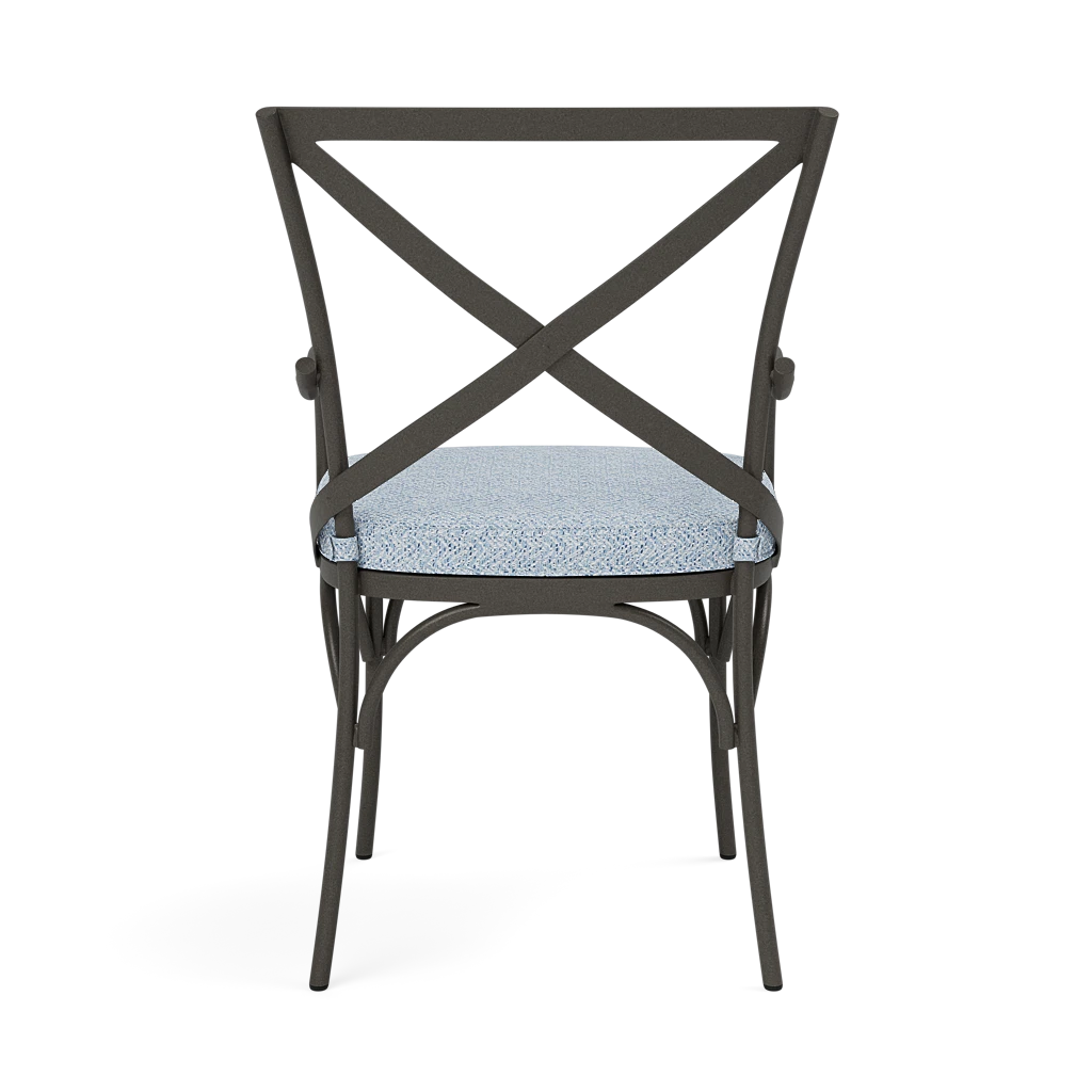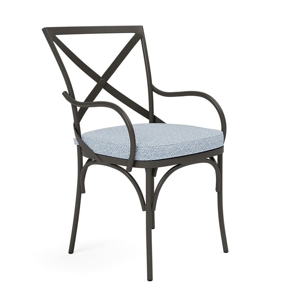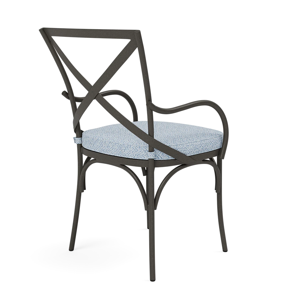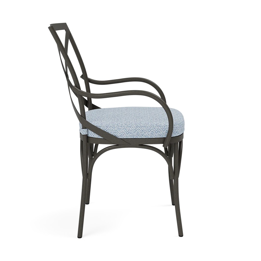 Sleek curves define the Beverly, our stylish take on a metal patio chair. The slightly arched back with elegant crisscross support, cushion, and rounded arms ensure this piece is comfortable—the most important characteristic a dining chair should offer. Cushion comes upholstered in our base fabric, Alsek White.
