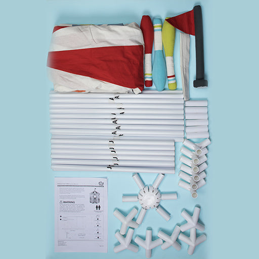 Constructed of 100% Cotton fabric with a metal frame, our Role Play™ Circus Tent Playhouse is quick and simple to assemble without the need of any tools, and comes equipped with 3 juggling clubs to instantly facilitate imaginative play.