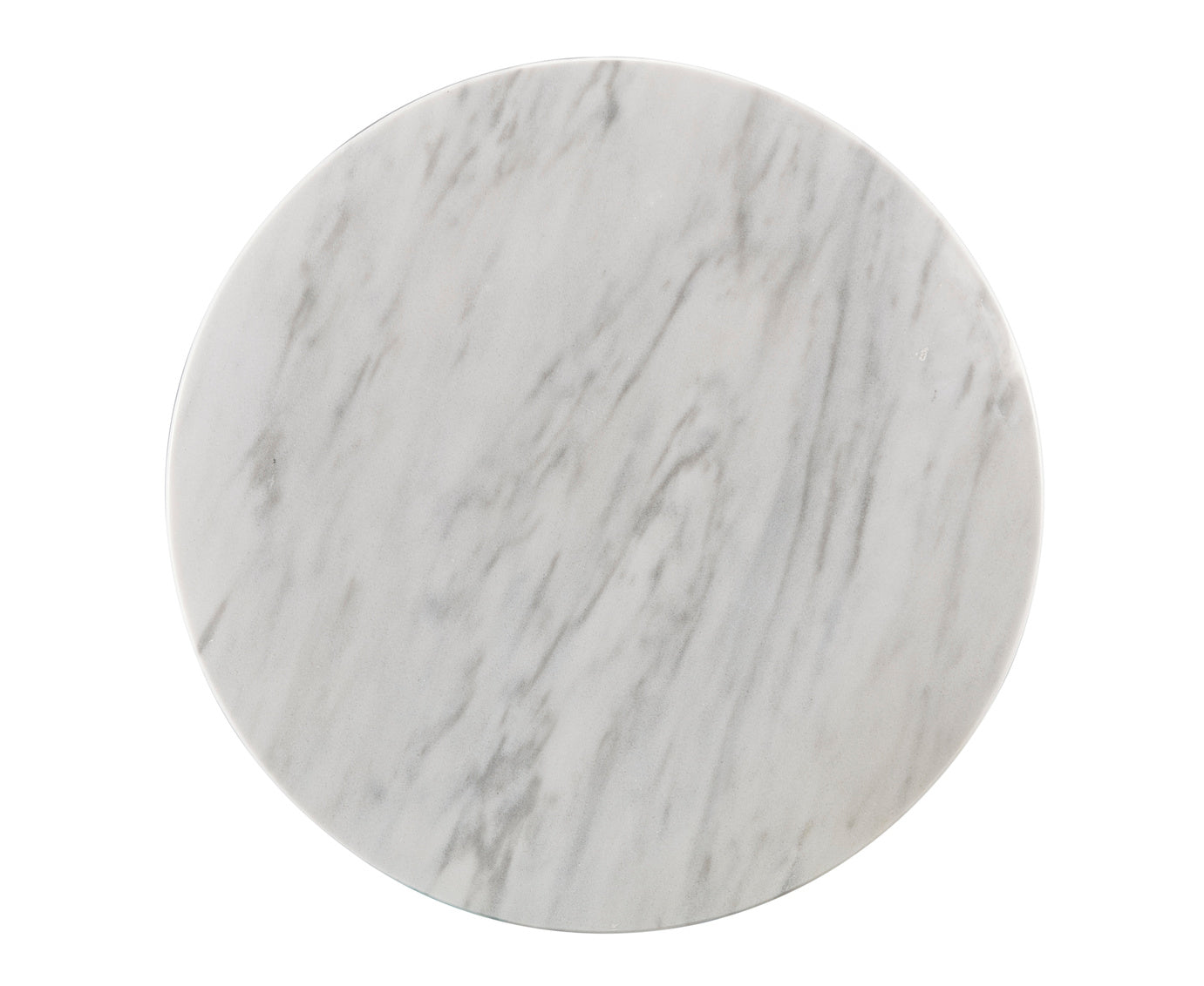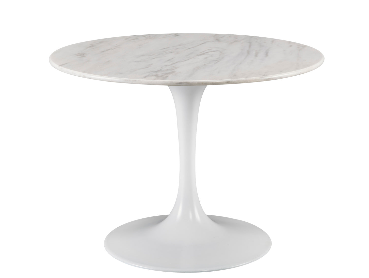 The Elliston Trumpet Table by Furniture Classics features a white iron trumpet base and a white marble top with natural gray veining. Minimalist and modern, this round table comfortably accommodates up to five smaller-scale chairs.