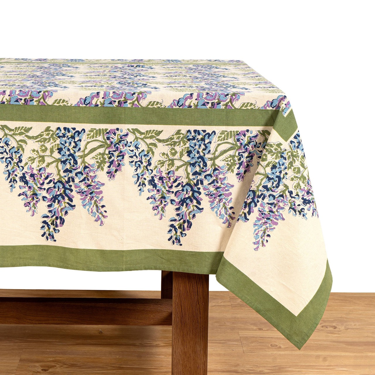The ivory background with it’s cascading blue and purple-tinged flowers create a beautiful landscape for your delicacies. Dine-in style amidst memories of gorgeously perfumed flower clusters. This elegant piece is a tasteful essential in every linen collection. Disclaimer: Round sizes do not have borders.