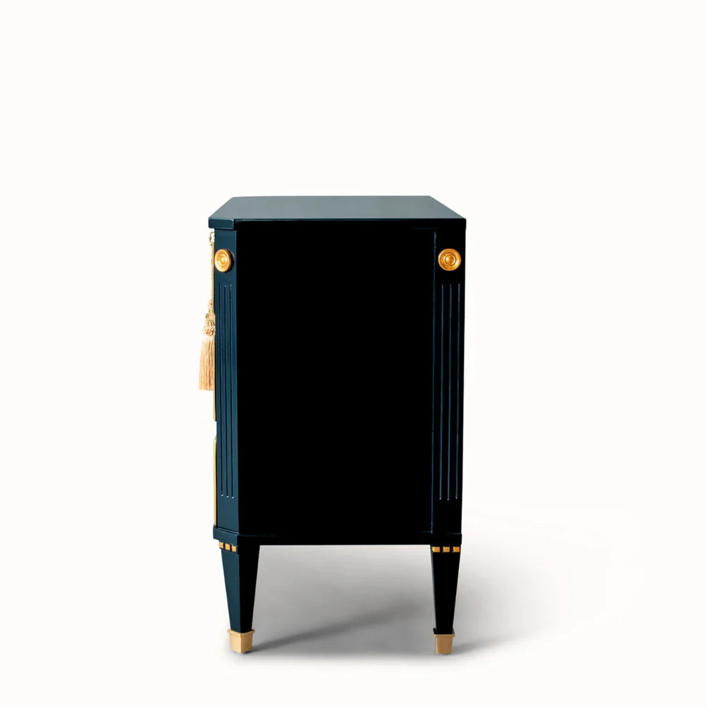 Manoir's exquisite Gustavian Dresser draws inspiration from the Gustavian style, a Swedish design movement of the 18th century featuring a pared back style influenced by French elements. The deep navy color adorned with a beautiful gold key tassel, adds a touch of sophistication and refinement that is at home equally in classic or modern interiors. Fine moldings gracefully frame the drawers, while the gold fittings lend an air of luxury. Crafted with utmost care from sustainable birch wood, this dresser features three spacious drawers for ample storage. 31.9 inches (W) x 16.9 inches (D) x 30 inches (H)