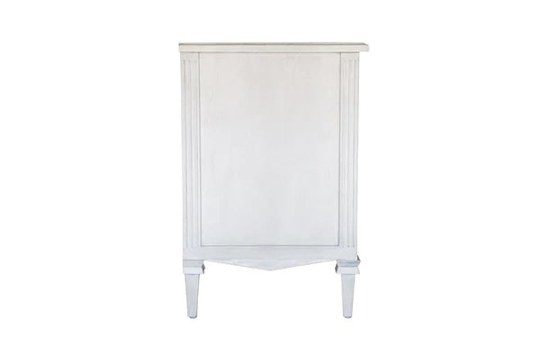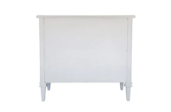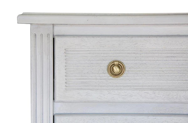 This is a Swedish Gustavian-style three-drawer dresser with fluted details and brass hardware. It features a white stained finish with grey undertones highlighting the wood grain.