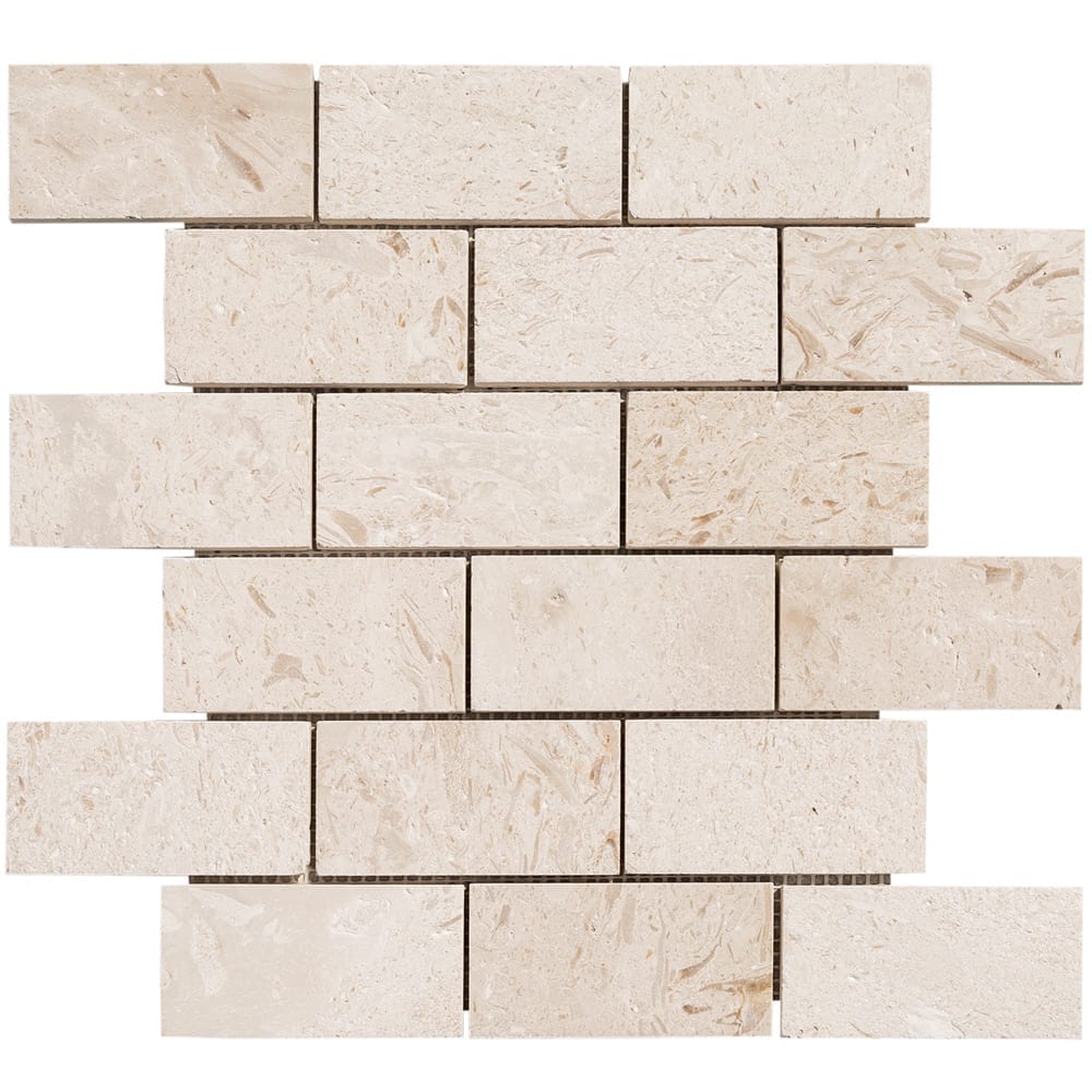 Mayra White Limestone Brushed Mosaic Floor and Wall Tile, it's easy to add a splash of contemporary styling to your decor. This attractive tile features seemingly 2"x4" Brick strips of limestone tile on a 12 in. x 12 in. mesh sheet that makes installation a much easier process. With neutral beige shades of natural limestone and fossil-like looks in various finishes, this tile creates a distinct pattern for install in kitchens, bathrooms and other residential or commercial spaces.