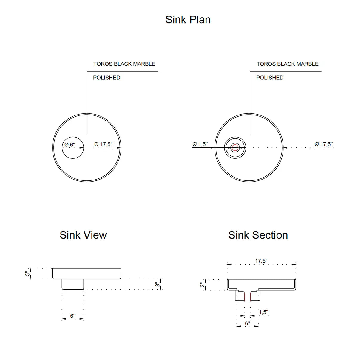 EXTERNAL DIMENSIONS - Diameter: 17.5 inches and 6 inches high with a standard 1.5 inch drain hole. Smooth and polished surface, very resistant to stains and can be easily maintained.